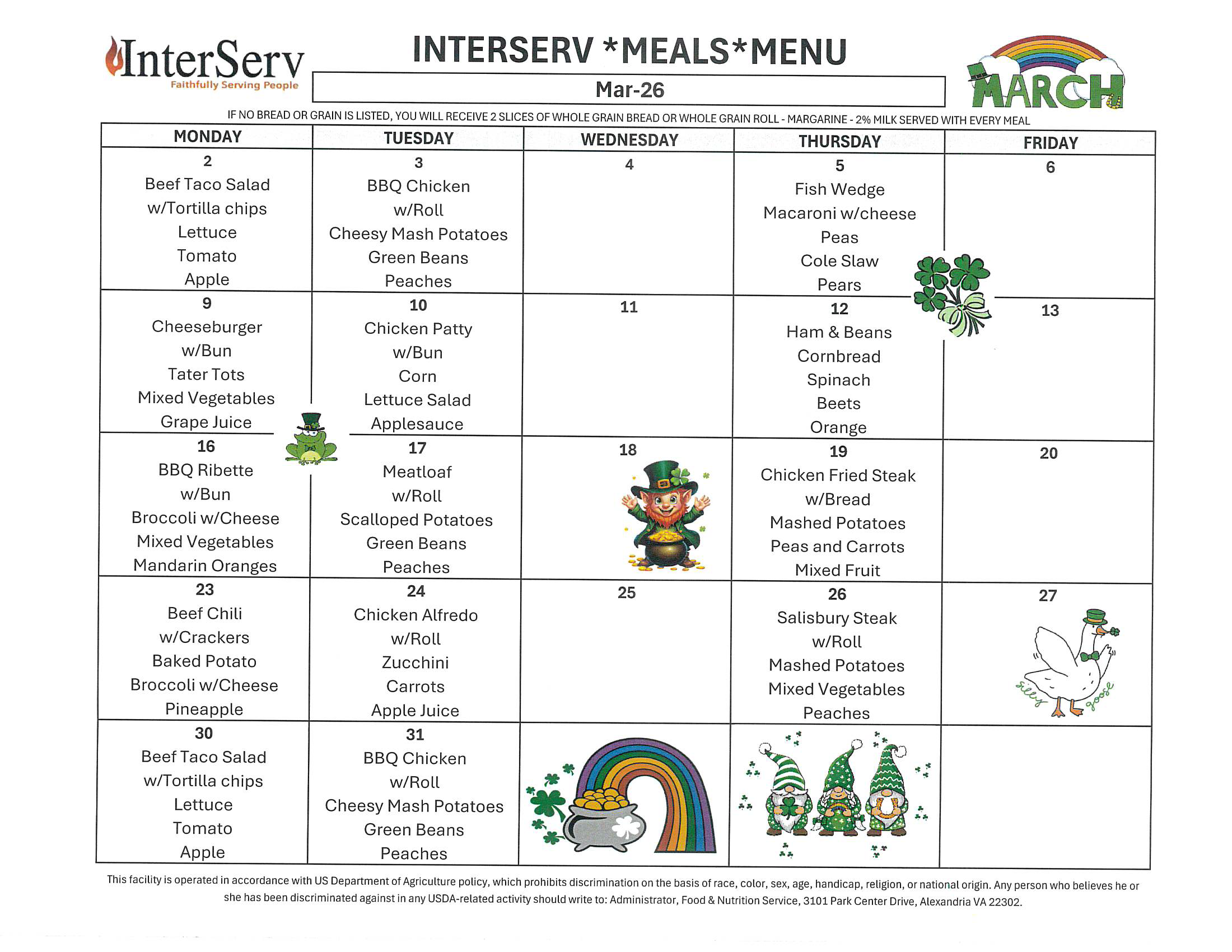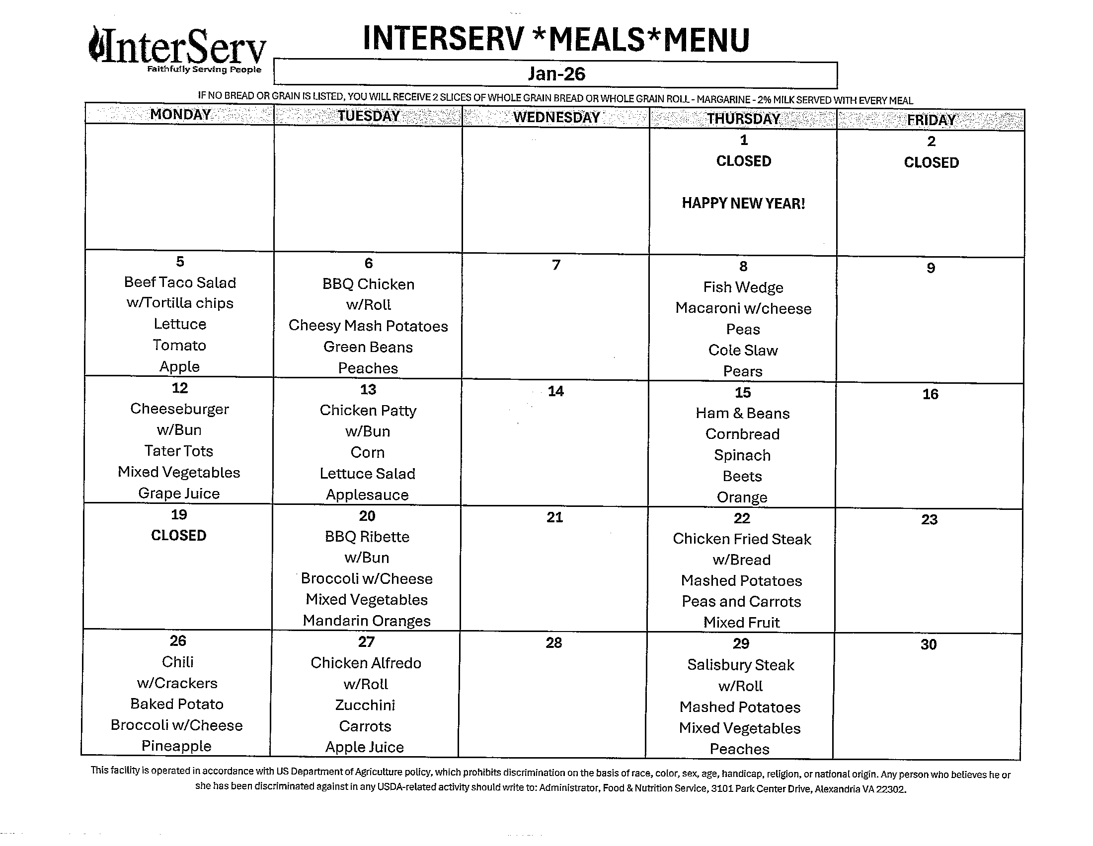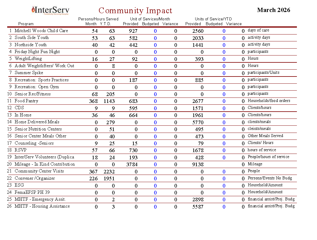 InterServ is a United Way Community Partner. Other Partners include: United Women of Faith and the Missouri Conference of the United Methodist Church, The Heartland Presbytery (PCUSA); The Missouri Mid-South Conference of the United Church of Christ; St. Joseph Community Development; and the USDA - The USDA is an equal opportunity employer and provider, MO General Revenue & DHSS/ Division of Senior & Disability Services through the Older Americans Act of 1965 and a contract with Young at Heart Resources, Inc.; and a contract with Second Harvest of Greater St. Joseph.
