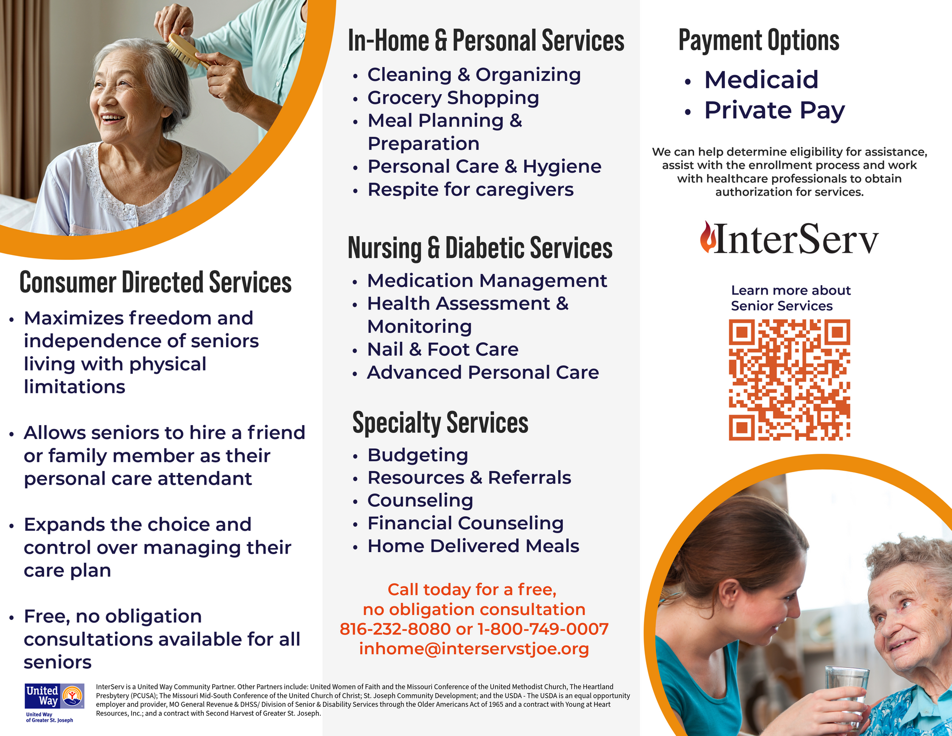 InterServ is a United Way Community Partner. Other Partners include: United Women of Faith and the Missouri Conference of the United Methodist Church, The Heartland Presbytery (PCUSA); The Missouri Mid-South Conference of the United Church of Christ; St. Joseph Community Development; and the USDA - The USDA is an equal opportunity employer and provider, MO General Revenue & DHSS/ Division of Senior & Disability Services through the Older Americans Act of 1965 and a contract with Young at Heart Resources, Inc.; and a contract with Second Harvest of Greater St. Joseph.